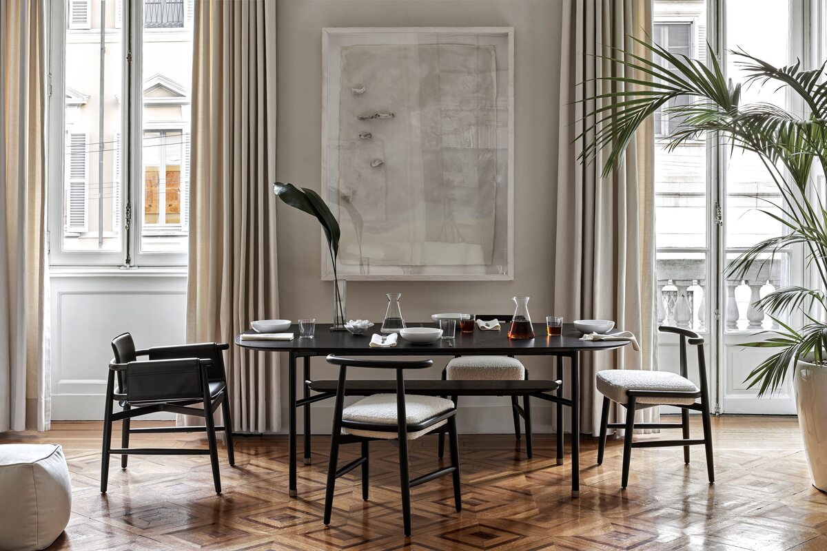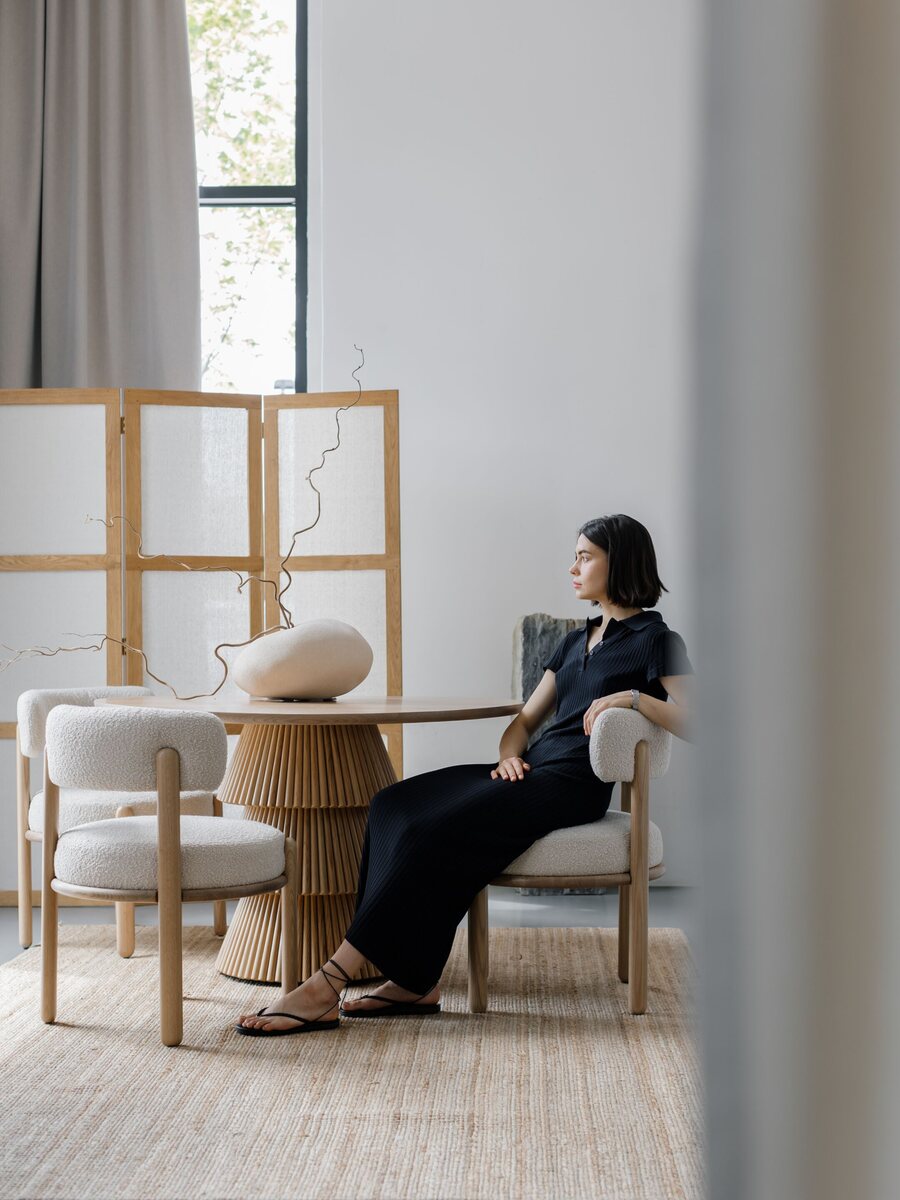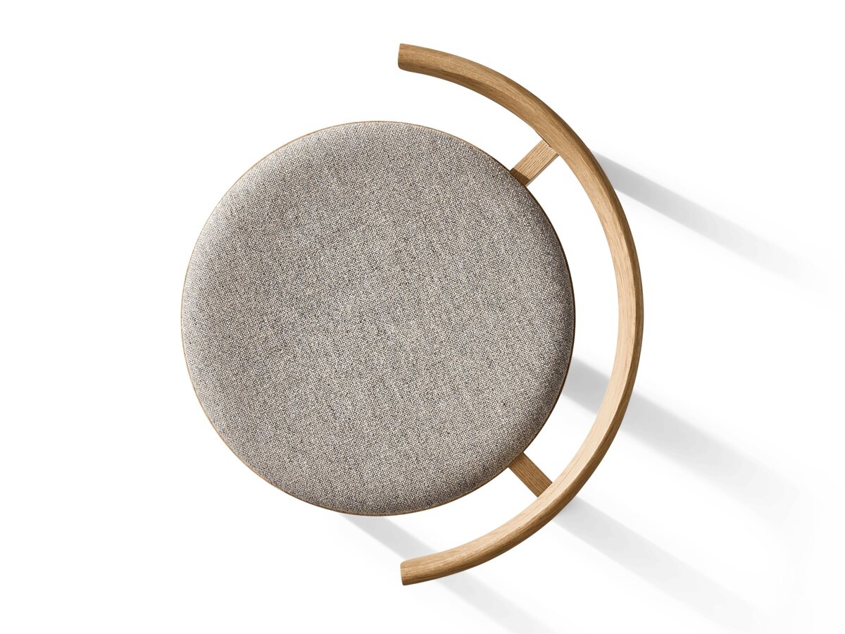 A sculptural dining chair with a curved veneer backrest and padded seat, offering comfort and timeless design.$980.00