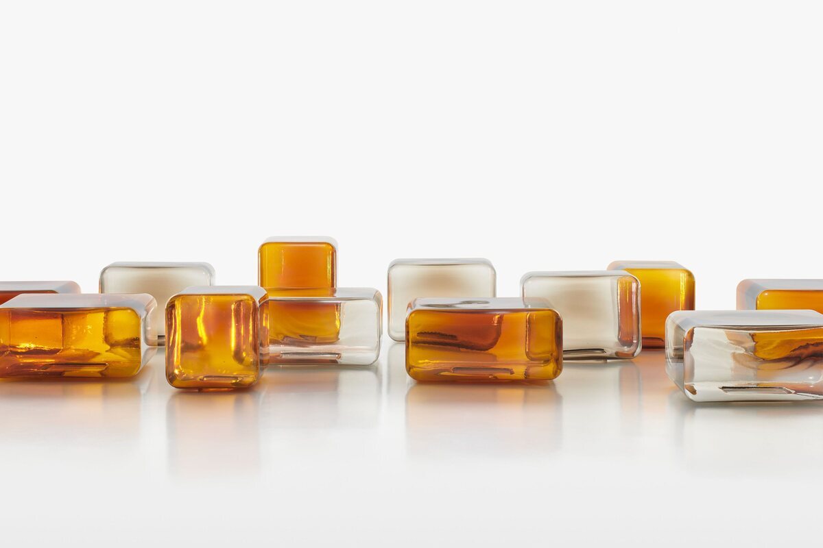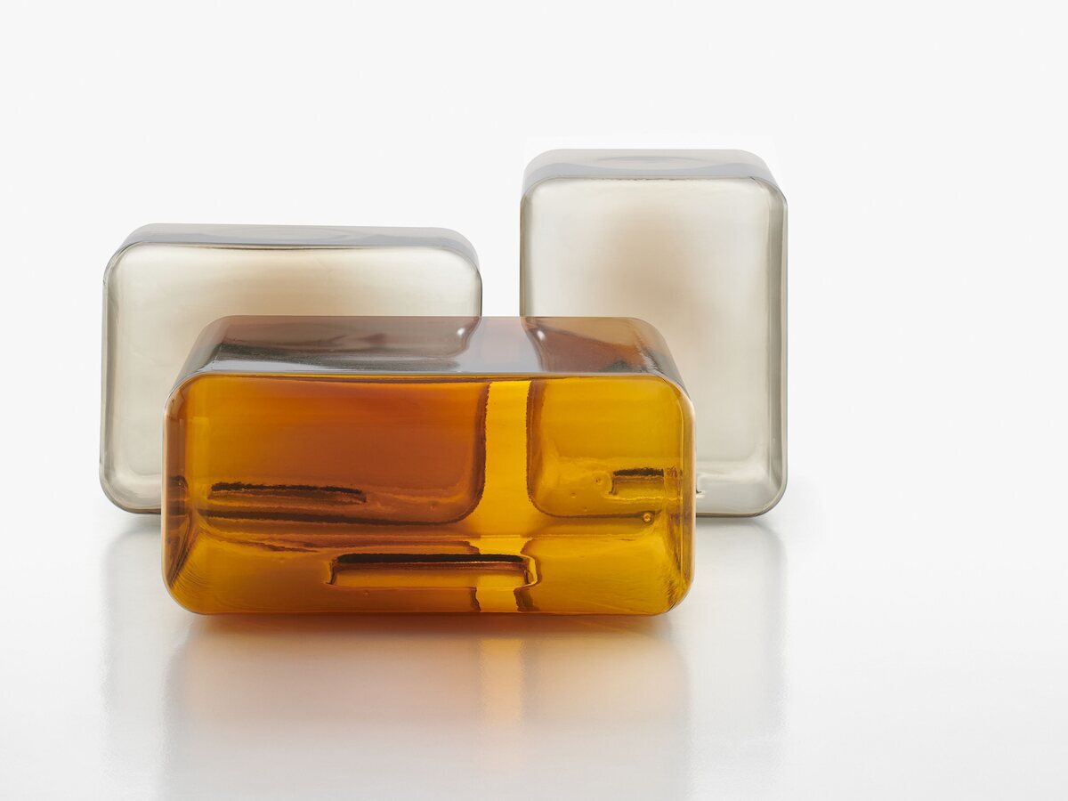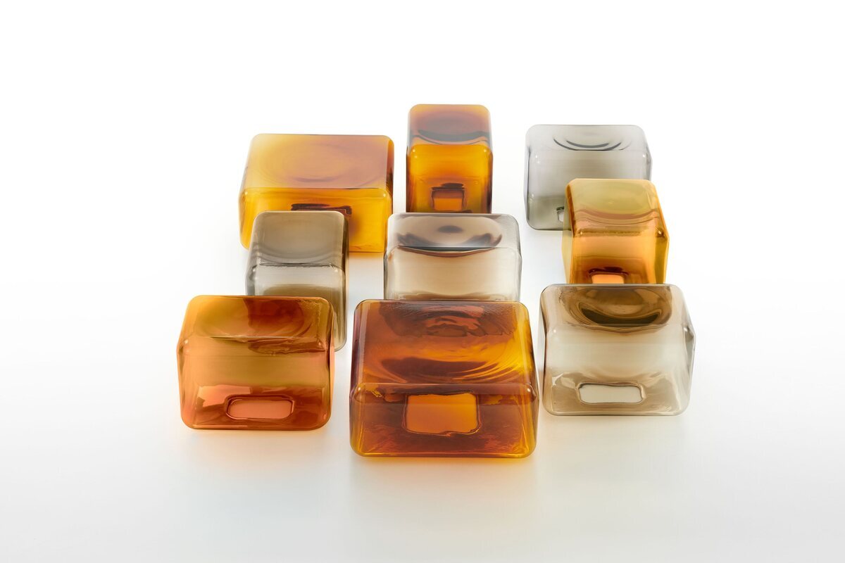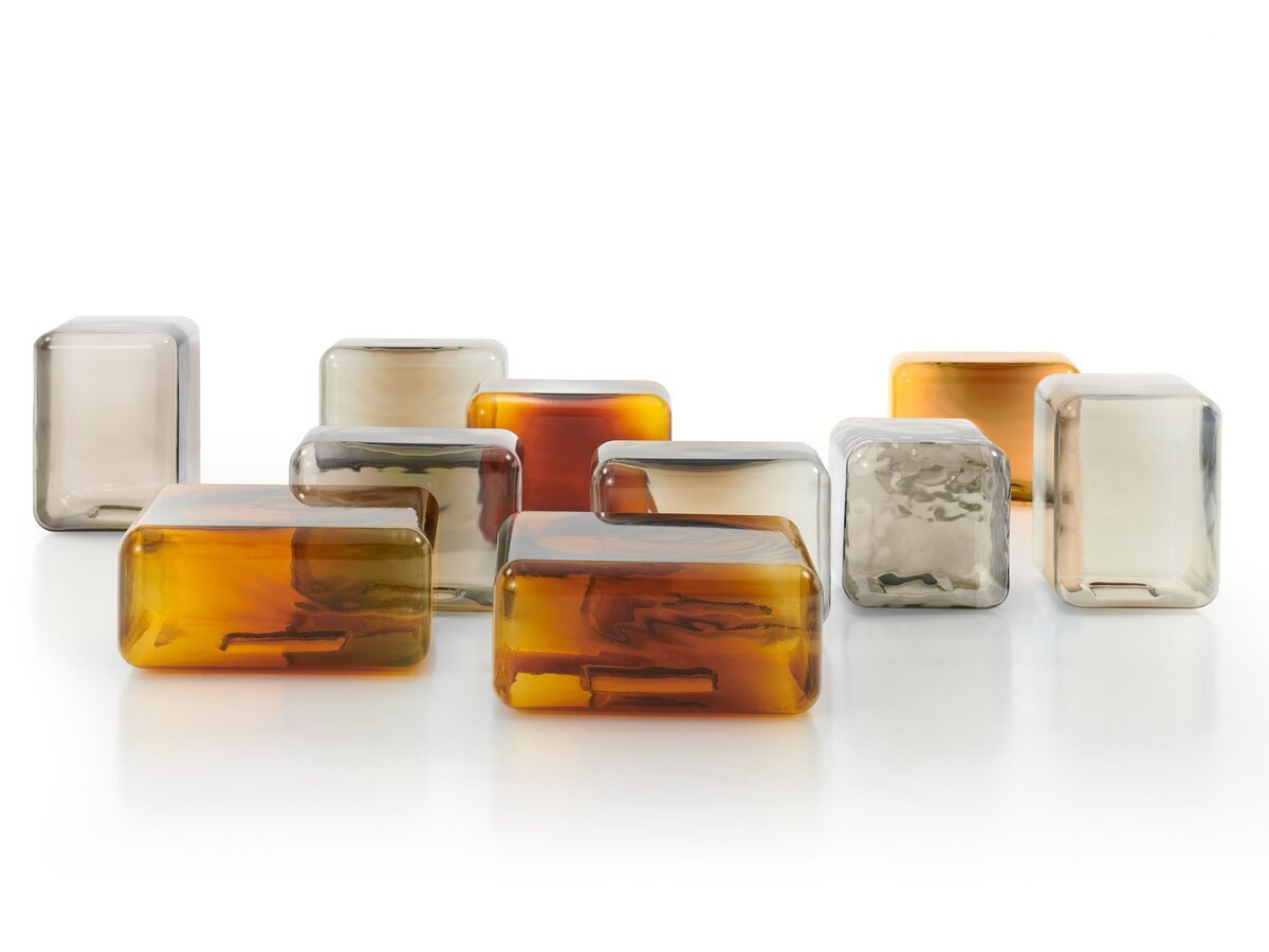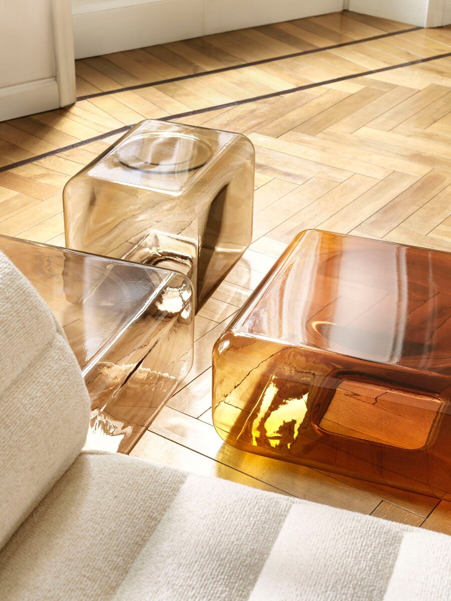 A sculptural coffee table made of blown glass with a glossy finish.
