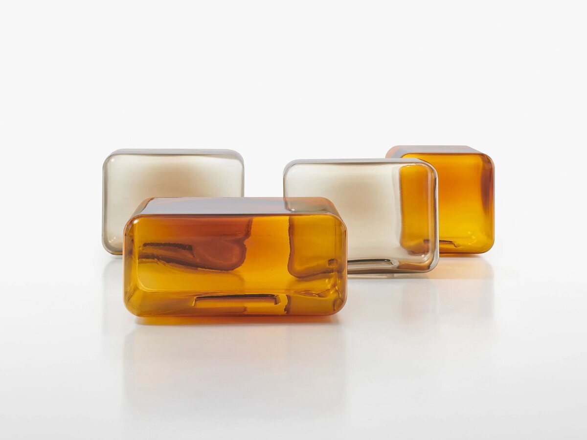 The Glass Coffee Table by Acerbis is crafted from crucible-tinted blown glass, available in amber or smoked grey. Designed by Sabine Marcelis, its minimalist shape and glossy finish create a strong visual impact.