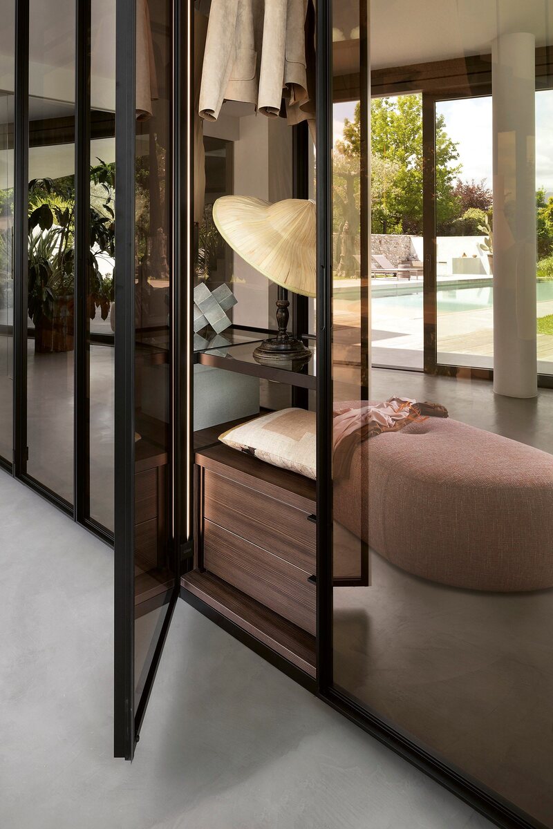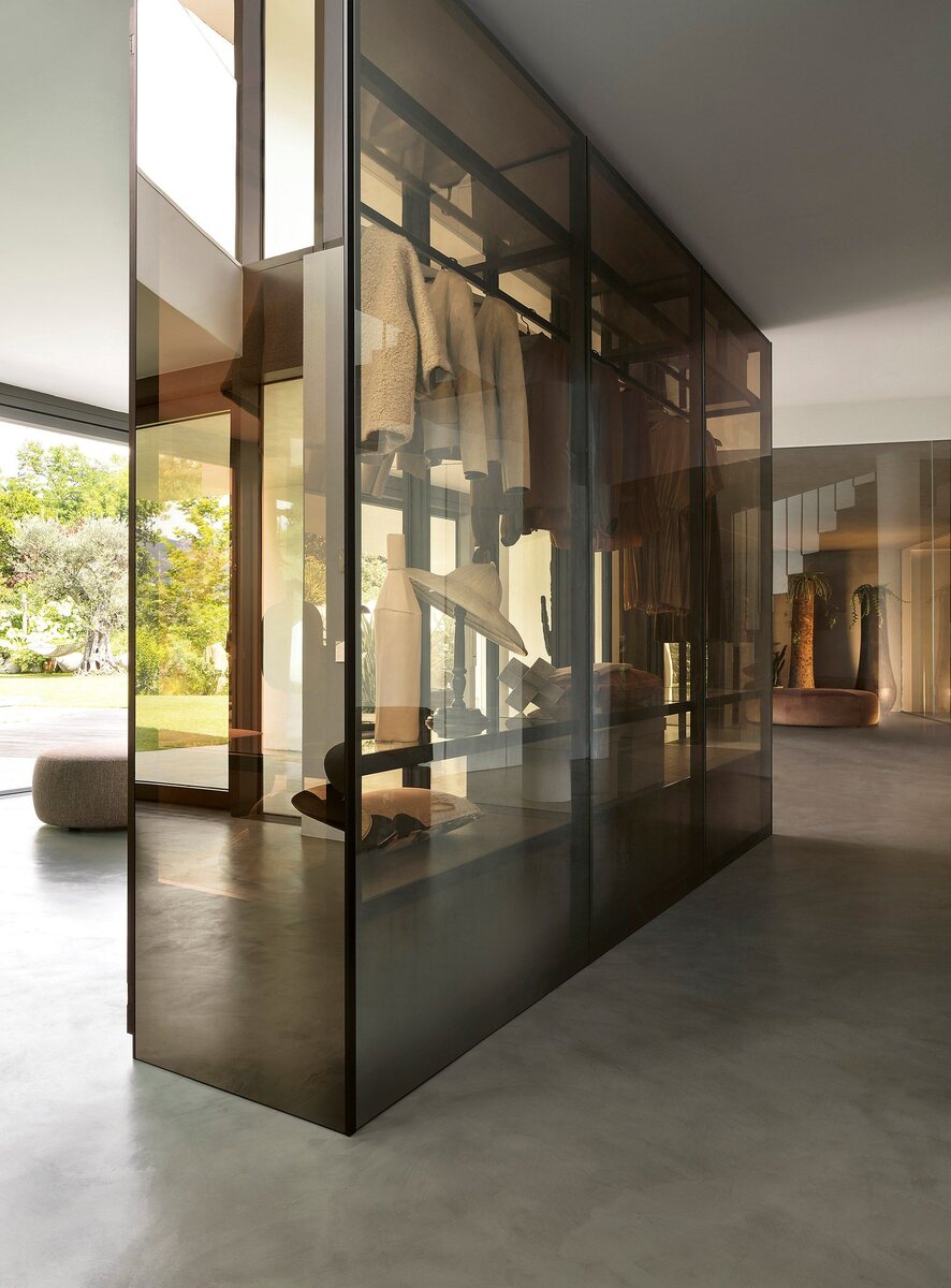 The Glass Wardrobe by Lema features all-glass doors and sides, aluminum structural elements, and built-in lighting options. Offers a refined, transparent look.