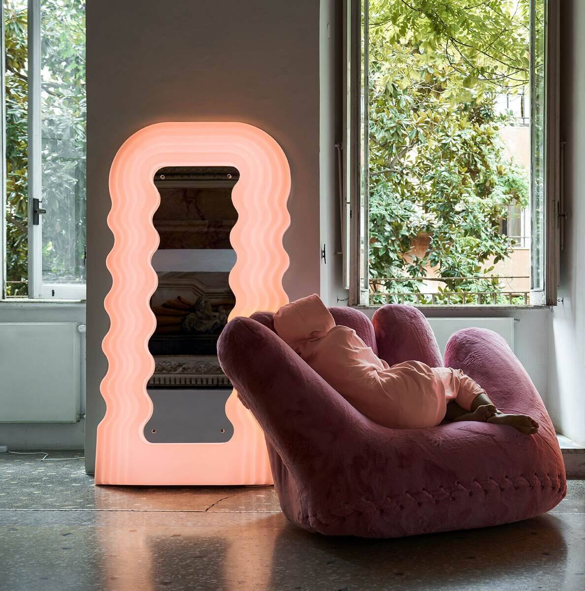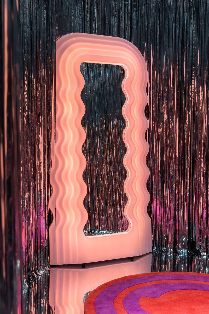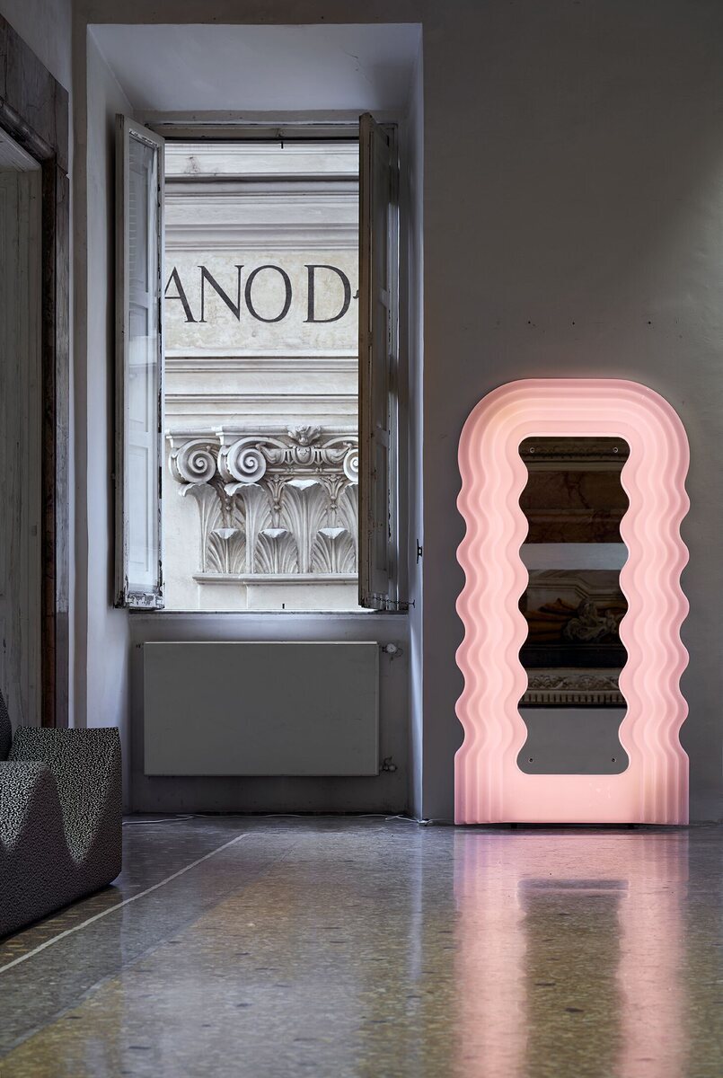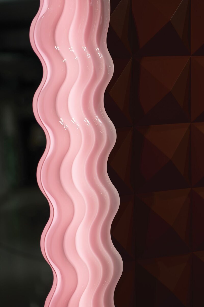 Iconic mirror with wavy pink frame and LED lighting.