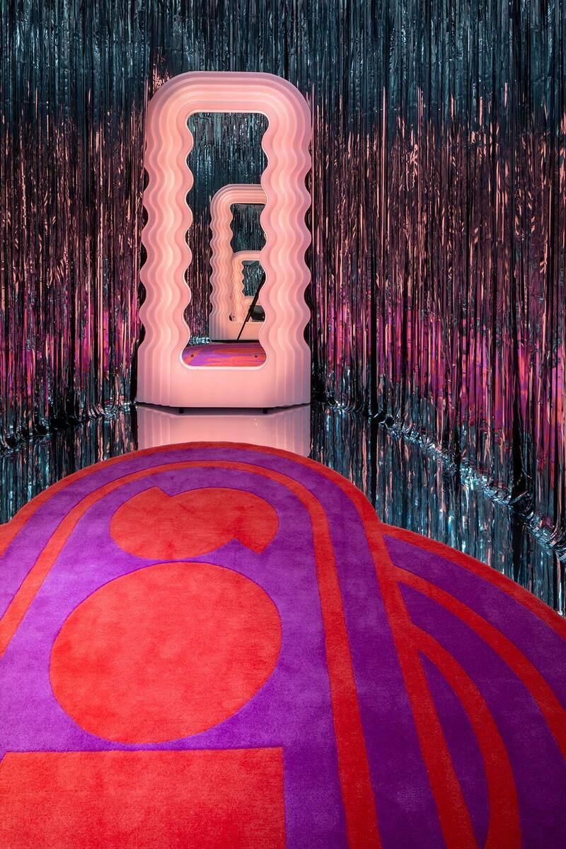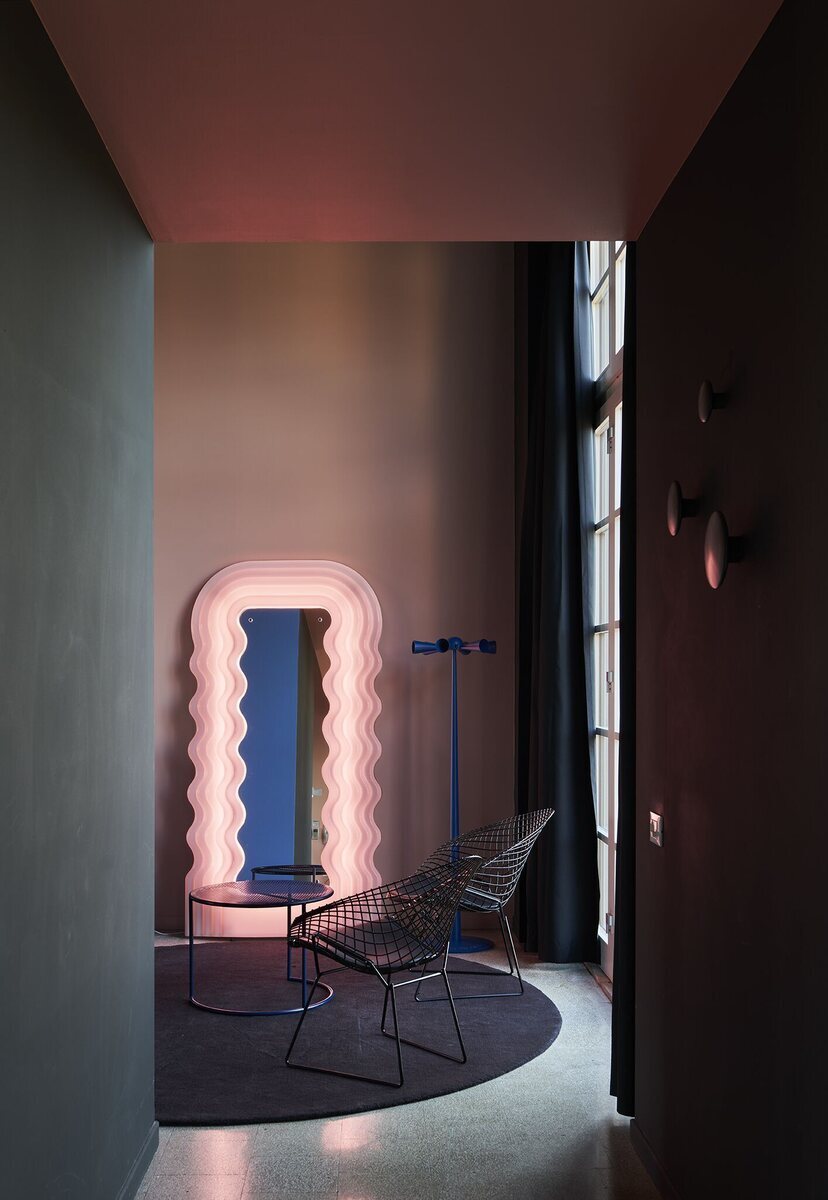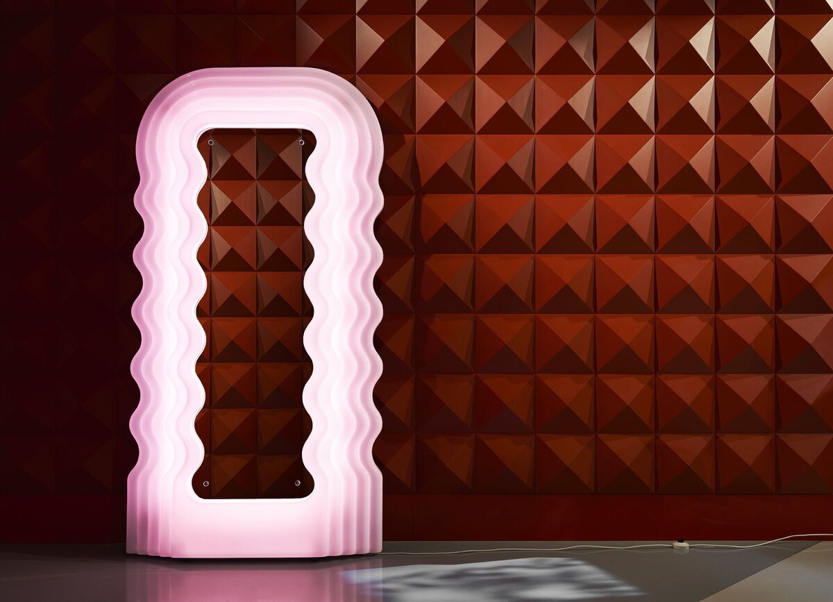 Iconic mirror with wavy pink frame and LED lighting.