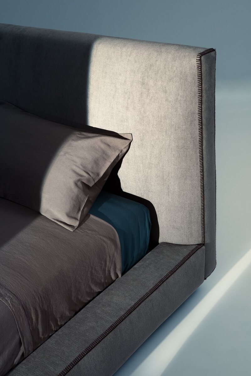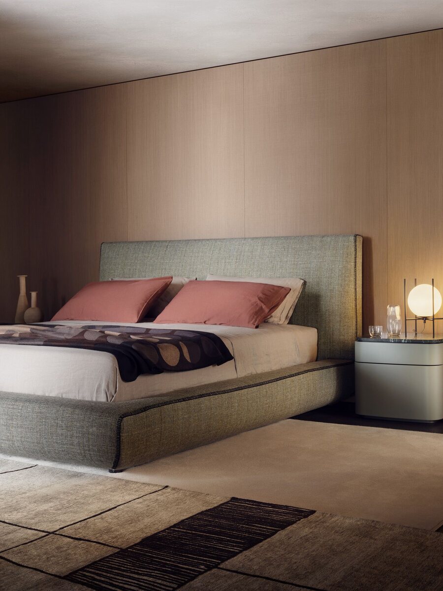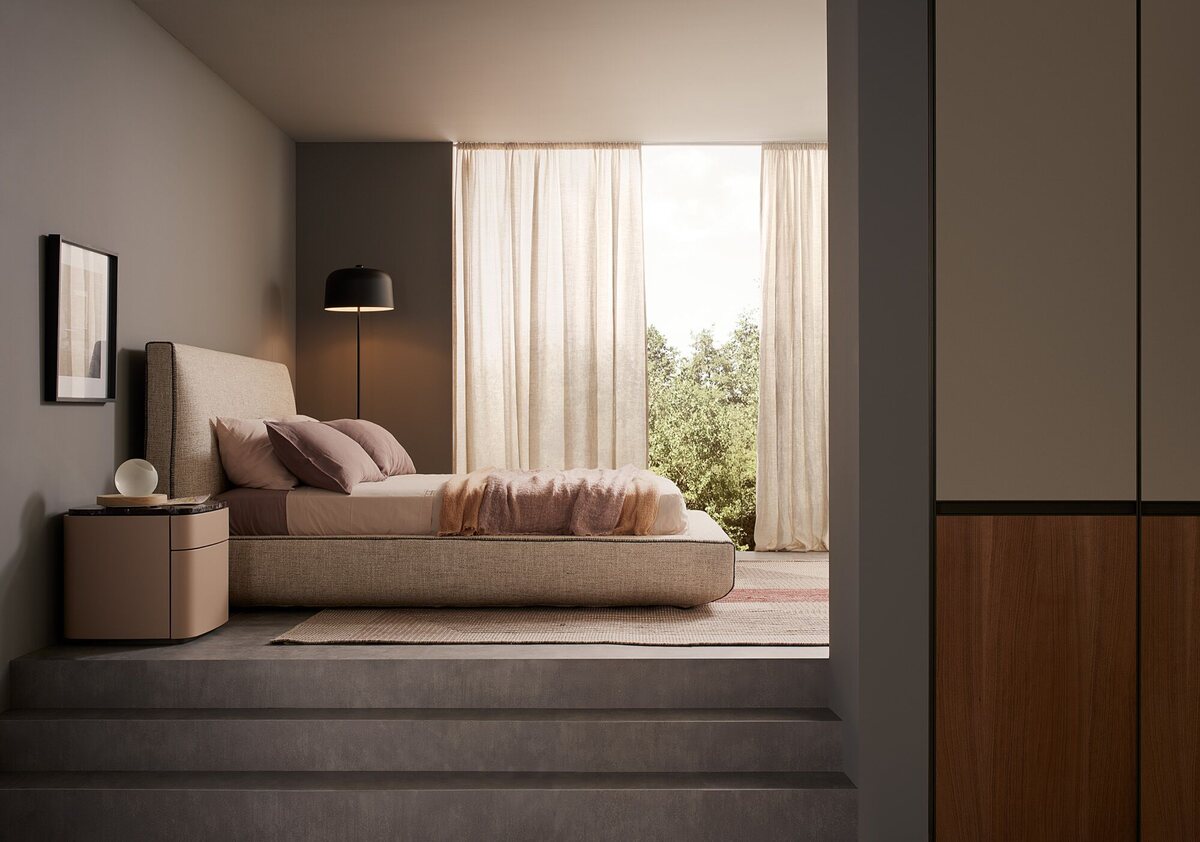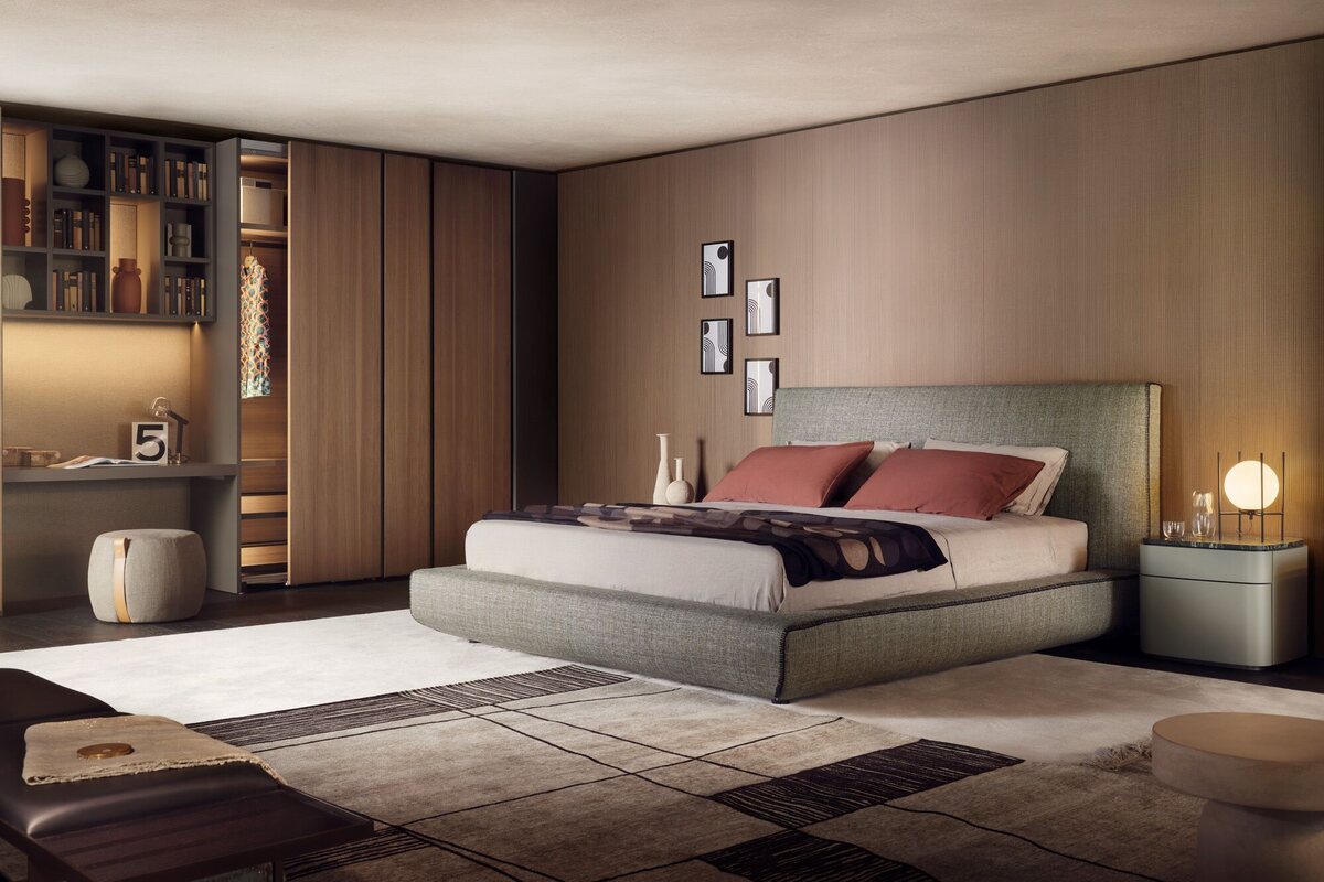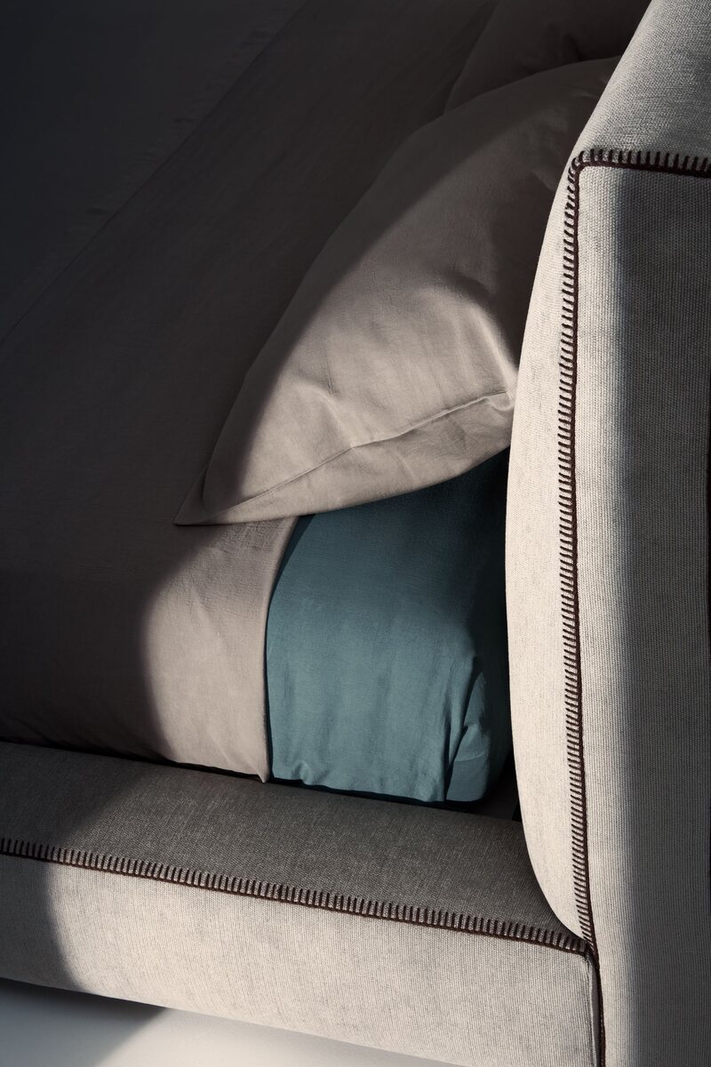 The Upholstered Storage Bed by Lema combines comfort with functionality, offering a spacious under-bed compartment. Upholstered in durable fabric with padded backrest.